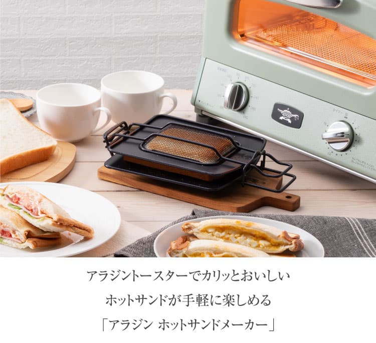 アラジン ホットサンドメーカーは、食パンのミミを切らずに食材をはさむだけ!カリッとおいしいホットサンドが作れます。アラジントースターをより楽しむ魅力がたっぷり詰まっています。お手入れ簡単で、安全面にもこだわったデザインです。