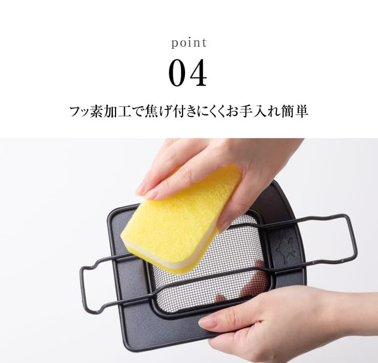 表面にフッ素加工が施されているので焦げ付きにくく、丸洗いも可能でお手入れ簡単。