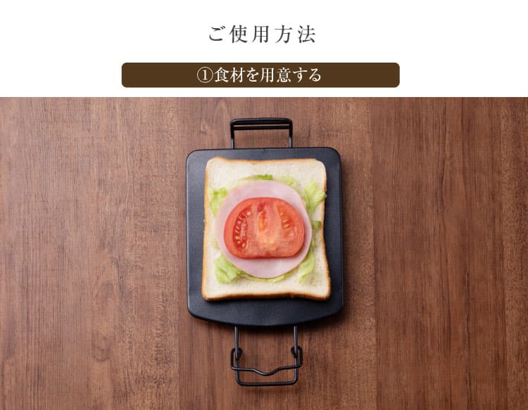 下プレートに食パンをおき、お好みの食材をのせてもう一枚の食パンで挟む。