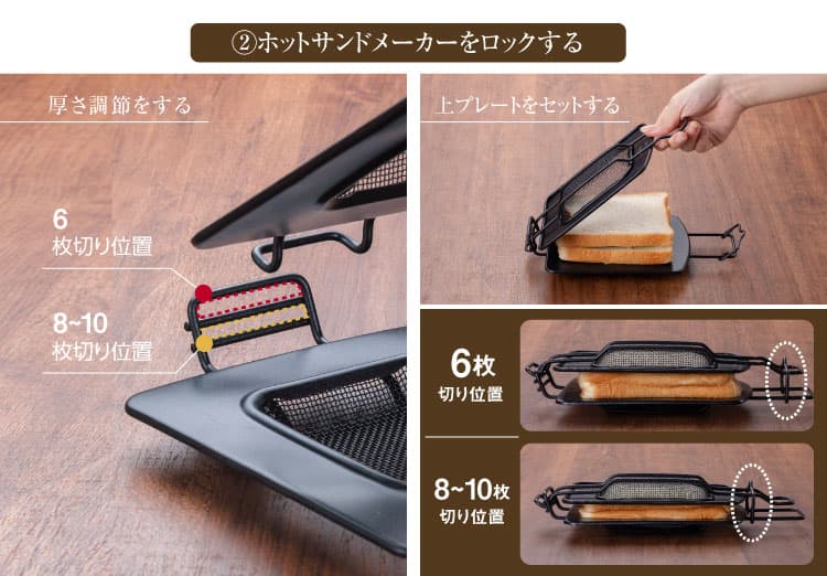 上プレートは厚さ調節をしてセットする。カチッと音が鳴るまでスライドフックを押し込みホットサンドメーカーをロックする。 (スライドフックは手前側が6枚切り位置、奥側が8〜10枚切り位置)