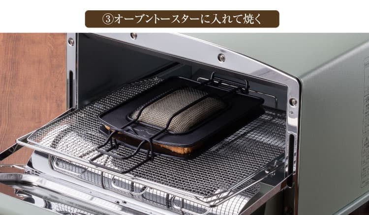調理時間は付属のレシピブックを参考にお好みの焼き加減で焼く。(裏面を濃く焼きたい場合は、途中で裏返す。) ※1000W未満のオーブントースターの場合は、調理時間を増やしてください。