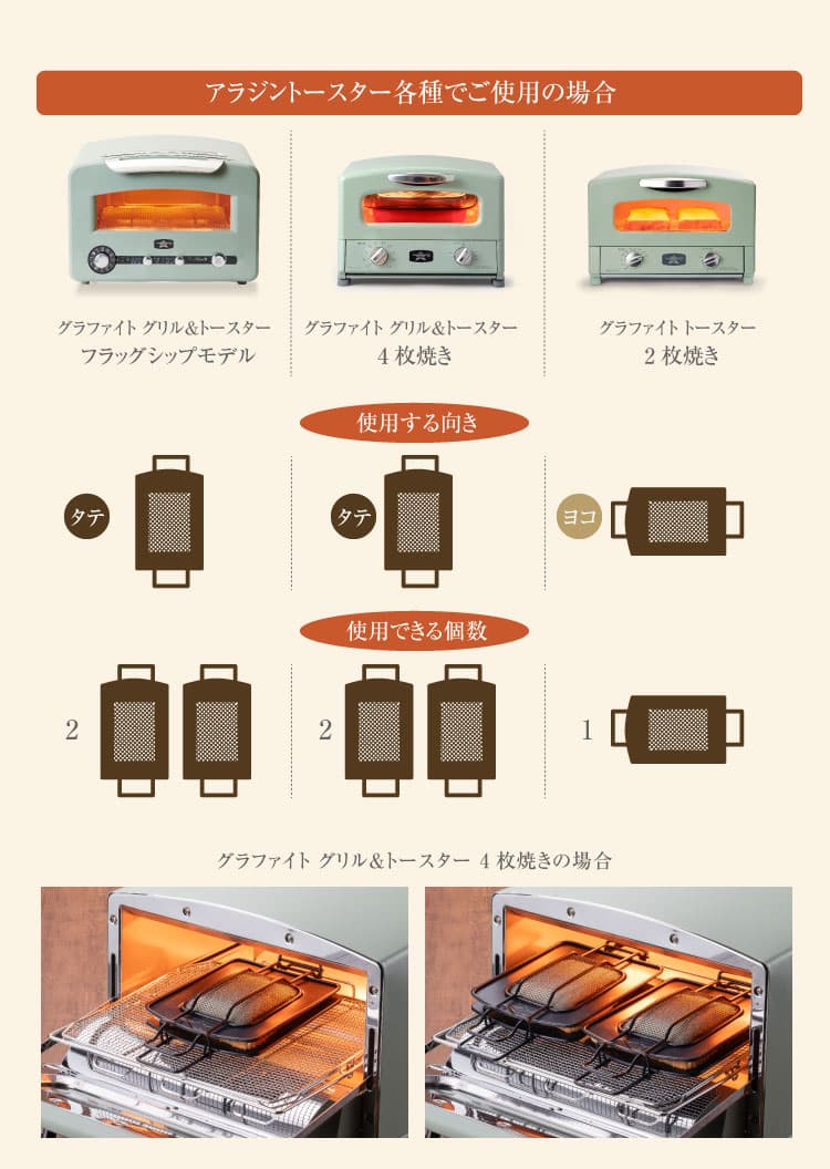 グラファイトトースター(2枚焼き)、グラファイト グリル&トースター(4枚焼き)、グラファイト グリル&トースター(フラッグシップモデル)で使用できます。 グラファイト グリル&トースター(4枚焼き)、グラファイト グリル&トースター(フラッグシップモデル)では、ホットサンドメーカーを縦に入れることで同時に2個作ることができます。